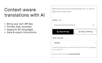 ContextTranslateは、Gemini AIの機能を活用してテキスト翻訳を強化するために設計された無料のChrome拡張機能です。これは、文脈を考慮した翻訳に焦点を当てており、ユーザーが92の言語で技術用語、イディオム、スラングの正確な解釈を受け取ることを保証します。このツールは、ユーザーが自分のAPIキー(BYOK)を利用することで翻訳コストを管理できるようにし、プライバシーとデータの所有権を確保します。サブスクリプション、追跡、広告がなく、信頼できる翻訳を必要とする誰にとってもシームレスな体験を提供します。